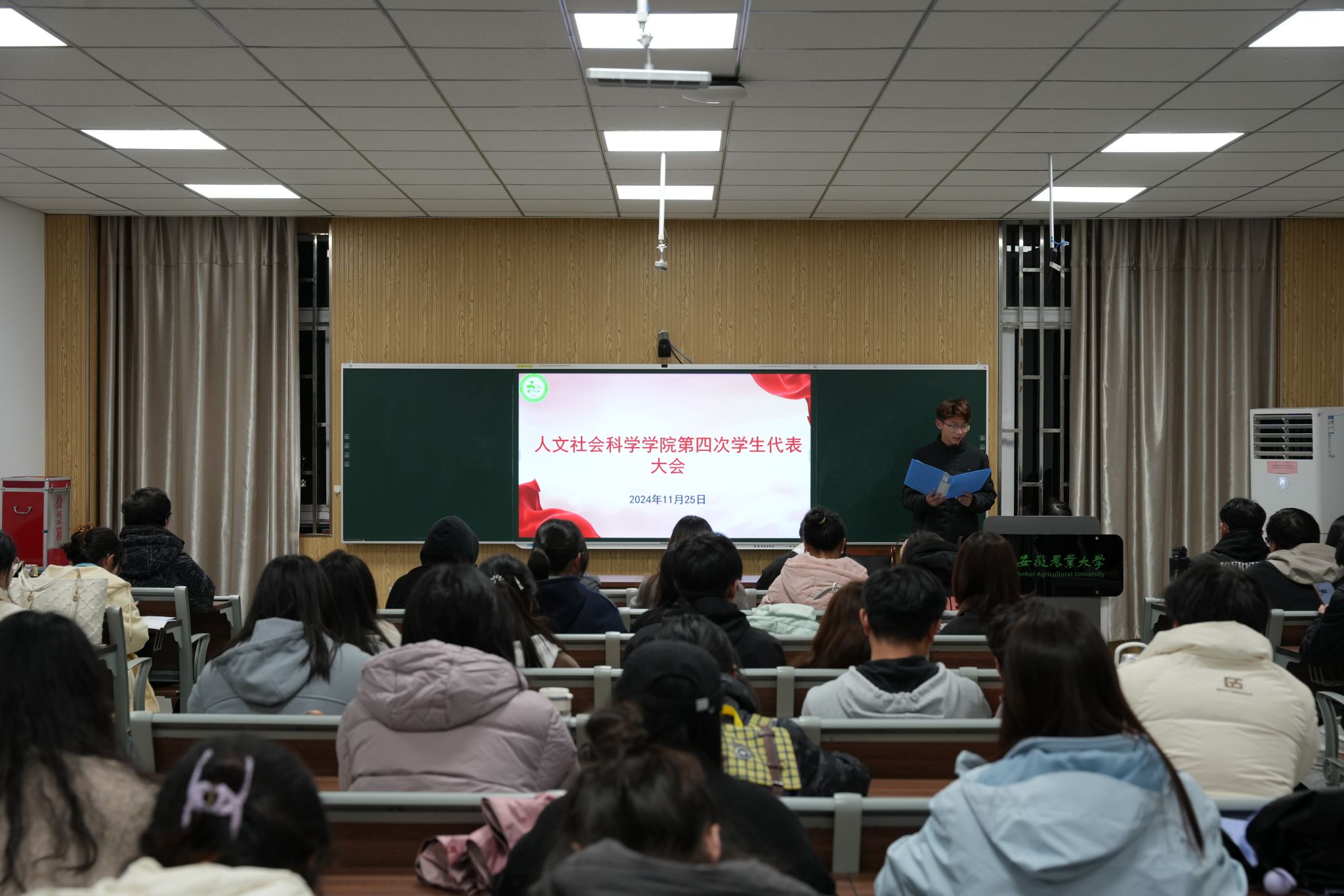 本网讯 11月25日,学院在人文楼202召开第四次学生代表大会,学院学生会指导老师姚吴仪、学生委员会主席团成员、52位学生代表出席会议。