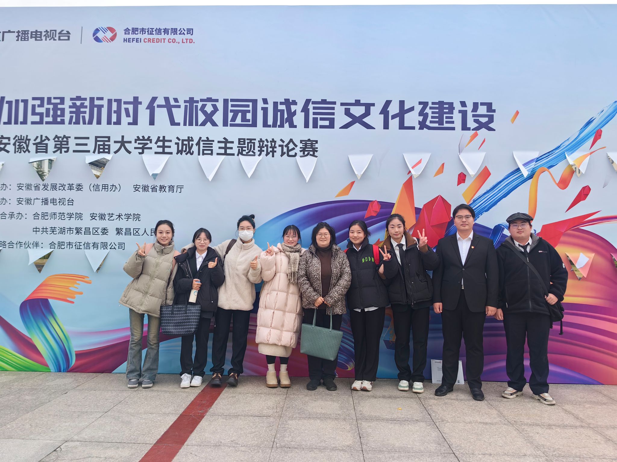 由安徽省发展改革委(安徽省信用办)、安徽省教育厅主办,安徽广播电视台承办,合肥师范学院、安徽艺术学院联合承办的安徽省第三届大学生诚信辩论赛在安徽艺术学院进行,合肥43所高校组队参赛。经广泛动员、精心组织,我校由人文社会科学学院8名学生组队代表学校参赛。在指导老师许敏智、王静的带领下,经过精心打磨辩论稿件,细致揣摩对手思路,最终在比赛中取得佳绩!