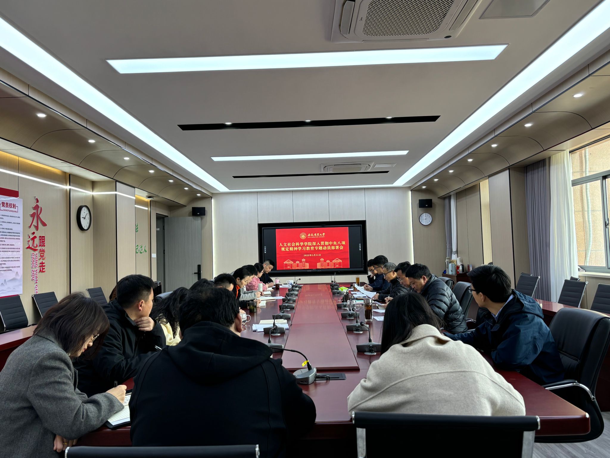本网讯 3月31日上午,人文社会科学学院党委召开深入贯彻中央八项规定精神学习教育动员部署会。会议学习传达了中共中央、安徽省委和校党委党的建设工作领导小组会议精神,全面启动深入贯彻中央八项规定精神学习教育工作。院领导班子成员、党委委员、科级以上干部、党支部书记参加会议。会议由院党委书记王冬平主持。