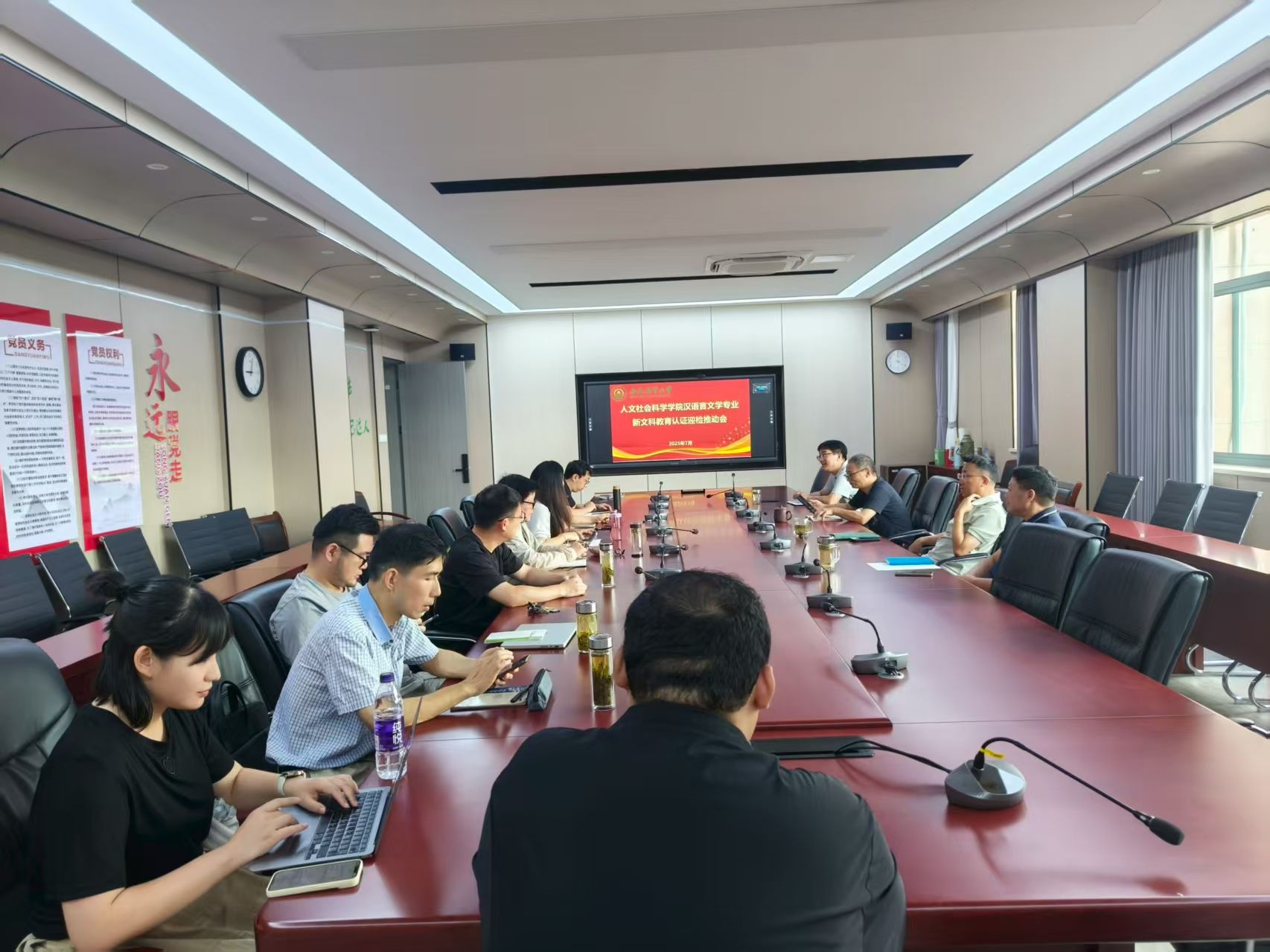 本网讯 为全面做好汉语言文学专业新文科教育认证专家进校考查的迎评工作,7月30日上午,人文社会科学学院在人文楼206会议室召开专项工作推进会议。学院党政领导、迎检小组成员及中文系全体教师通过线上线下相结合的方式参会,会议由院长方国武主持。