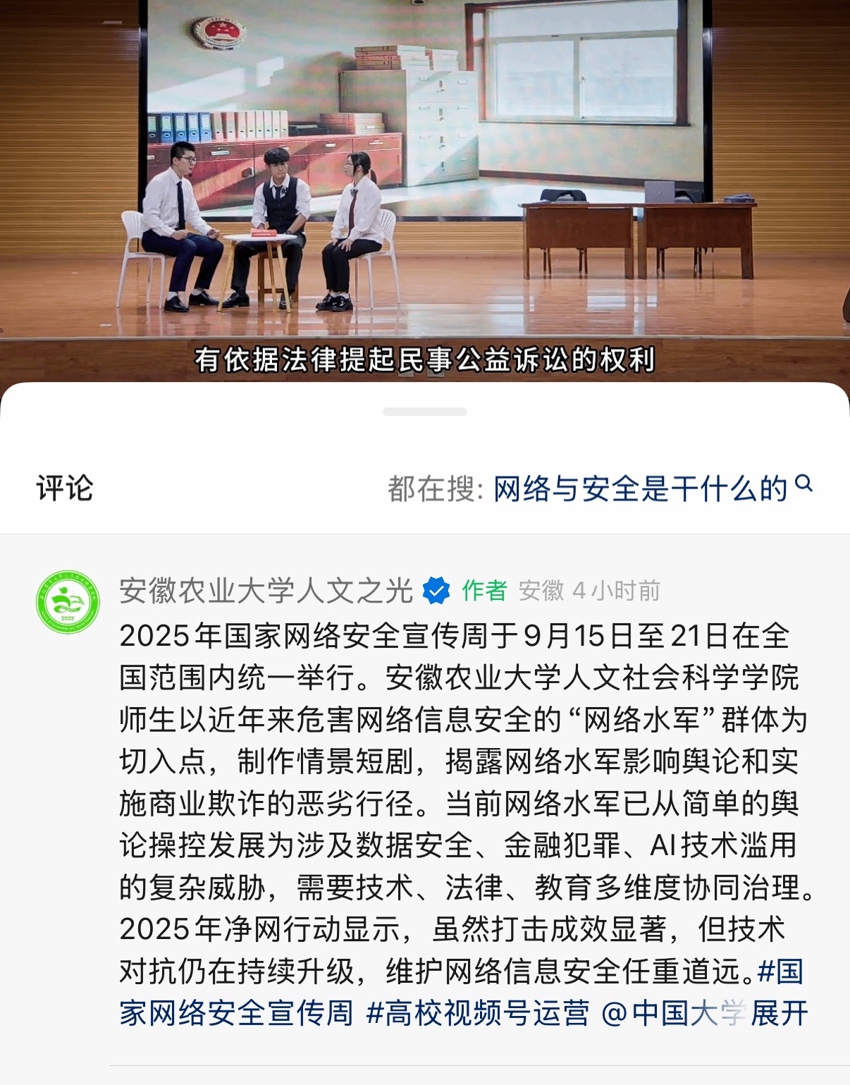 学院师生围绕近年来危害网络信息安全的“网络水军”群体为切入点,制作网络安全情景剧,揭露网络水军影响舆论和实施商业欺诈的恶劣行径。通过影音并茂的形式,积极普及网络安全知识,推广网络安全技能,引导学院师生树立正确的网络安全观。