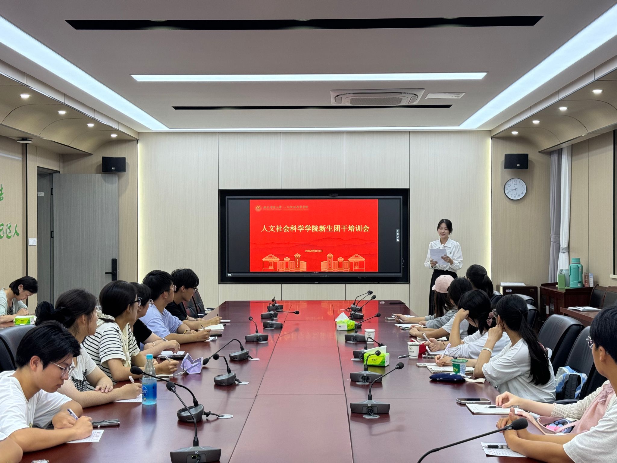 本网讯 为进一步加强基层团组织规范化建设,着力提升新生团干部政治意识和业务能力 ,9月23日晚,人文社会科学学院在人文楼206会议室召开2025级新生团干培训会。院团委委员和2025级全体团干参加培训会,会议由院团委负责老师主持。