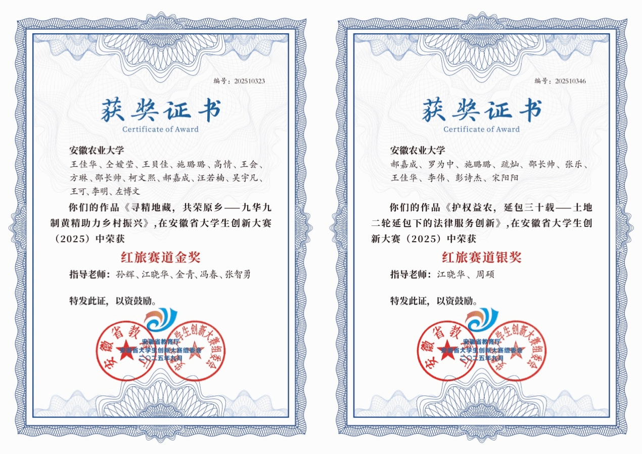 本网讯 近日,中国国际大学生创新大赛(2025)安徽省总决赛获奖证书正式公布。人文社会科学学院在此次大赛中表现优异,共获安徽省金奖1项、银奖1项。