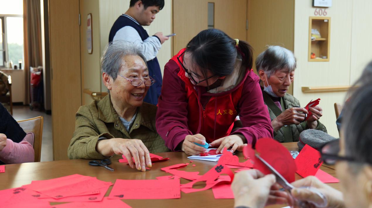 一纸一剪,传递温情。活动现场,志愿者们将专业知识融入服务,协助认知障碍长者完成剪纸创作。一张张红纸化作寓意吉祥的窗花与“福”字,既传承了非遗文化,也提供了专业的心理支持与社交参与机会。