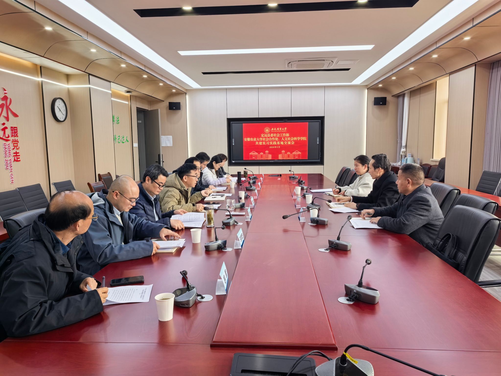 本网讯 为深入贯彻落实中央社会工作部、教育部关于加强社会工作专业实习实践基地建设的相关要求,推动社会工作专业教育与基层社会治理实践深度融合,3月4日,安徽农业大学与定远县委共建社会工作专业实习实践基地合作洽谈会在人文楼举行。人文社会科学学院、社会合作处、江淮分水岭试验站及定远县委社会工作部相关负责人及教师代表参会。人文社会科学学院副院长江晓华主持。