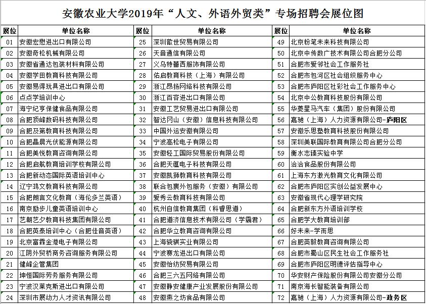 安徽农业大学2019年“人文、外语外贸类”专场招聘会展位图 日期:2019年03月18日 00:00 作者: 点击: 上一条:转发省社科联“关于开展2019年度三项课题研究活动的通知” 下一条:2019年人文社会科学学院、马克思主义学院寒假值班表
