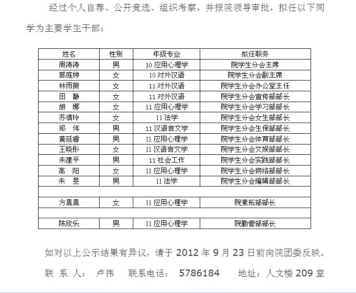 人文社会科学学院主要学生干部拟任名单公示 日期:2012年09月20日 00:00 作者: 点击: 上一条:关于下发2012年下半年“一月一主题”主题班会活动内容安排的通知 下一条:第44期大学生入党积极分子培训班教学安排表