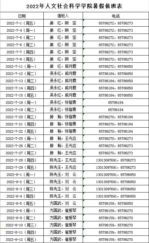 2022年人文社会科学学院暑假值班表 日期:2022年06月27日 15:32 作者: 点击: 上一条:关于举办第十六届“兴农杯”大学生课外学术科技作品竞赛的预通知 下一条:人文社会科学学院教职工周三政治理论集中学习制度