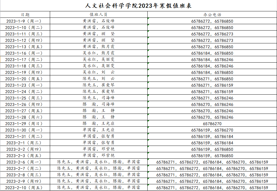 人文社会科学学院2023年寒假值班表 日期:2023年01月07日 17:23 作者: 点击: 上一条:人文社会科学学院“优秀研究生”“优秀研究生干部”评选细则 下一条:人文社会科学学院2023年元旦党政管理人员值班安排表