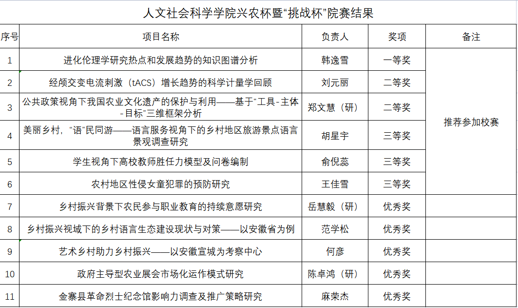 关于人文社会科学学院兴农杯暨“挑战杯”院赛结果的公示 日期:2023年03月08日 22:43 作者: 点击: 根据学院《关于举办第十六届“兴农杯”大学生课外学术科技作品竞赛院赛的通知》的要求,本着公开、公平和公正原则,经个人报名、学院评审,拟推荐《进化伦理学研究热点和发展趋势的知识图谱分析》等6个项目到学校参加竞赛。如对以上结果有异议,请于3月10日前反映。联系人:张智勇,联系电话:0551-65786184。 安徽农业大学人文社会科学学院 2023年3月8日 上一条:人文社会科学学院2022年省级大创项目评审结果公示 下一条:关于2023年省、校级优秀毕业生(研究生)评选结果的公示