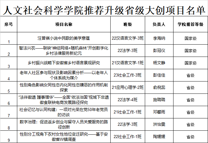 人文社会科学学院2023年省级、2024年国家级大创项目评审结果公示 日期:2024年06月04日 14:34 作者: 点击: 根据学校《关于组织申报2023年省级和2024年国家级大学生创新创业训练计划项目的通知》的要求,本着公开、公平和公正原则,经过个人申请、指导老师推荐、专家评审,拟推荐《汪曾祺小说中民歌的美学意蕴》等3个项目为国家级大创项目立项对象、《老年人社区参与现状及影响因素分析——以老年人个体系统为媒介》等6个项目为省级大创项目立项对象(具体名单如下)。如果对以上结果有异议,可以向学院办公室反映,截止日期为2024年6月6日。联系人:张智勇 电话:65786184人文社会科学学院2024年6月4日 上一条:人文社会科学学院2024年大学生暑期“三下乡”社会实践推荐校级参与评选团队公示 下一条:人文社会科学学院2023-2024学年第二学期 第十三周上课抽查情况公示