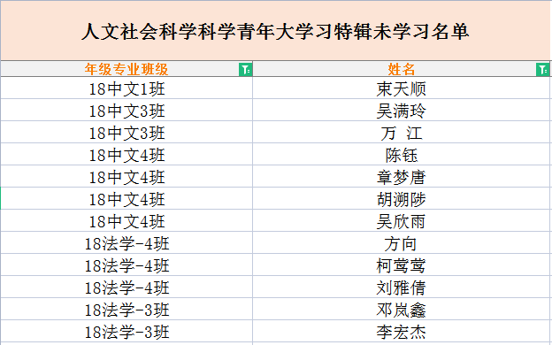 人文社会科学科学青年大学习特辑未学习名单 日期:2022年05月23日 20:01 作者: 点击: 上一条:追寻红色印记,担当时代责任--人文社会科学学院“赴安徽凤阳小岗村团队”开展暑期三下乡活动 下一条:人文社会科学科学青年大学习第十二期未学习名单