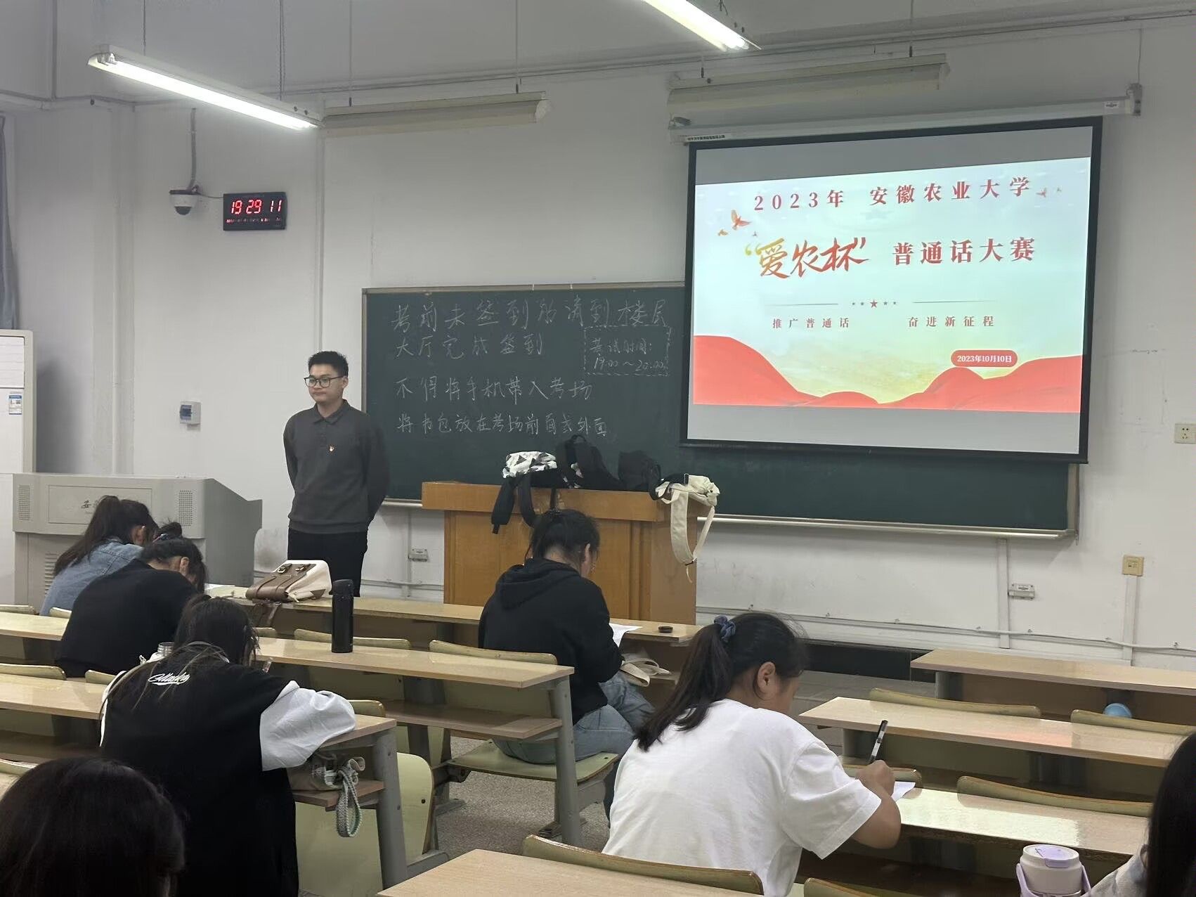 本次大赛分为初赛和决赛两个阶段。10月10日晚,“爱农杯”普通话大赛初赛正式开始,五百余名参赛者进行时长一小时的线下笔试,初赛试题由填空、选择、判断、注音、写作等五种题型组成,多角度、全方位地考察了参赛选手的普通话常识性知识储备。