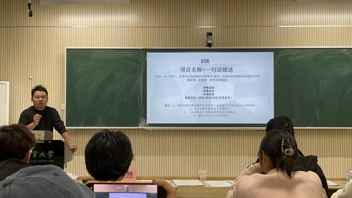 赛后,吴蒙然作《项目PPT制作与路演答辩能力提升》专题培训,从封面、项目背景、技术核心、市场分析等多方面指出本次答辩环节中共性问题及优化方向,助力各项目进一步打磨提升。