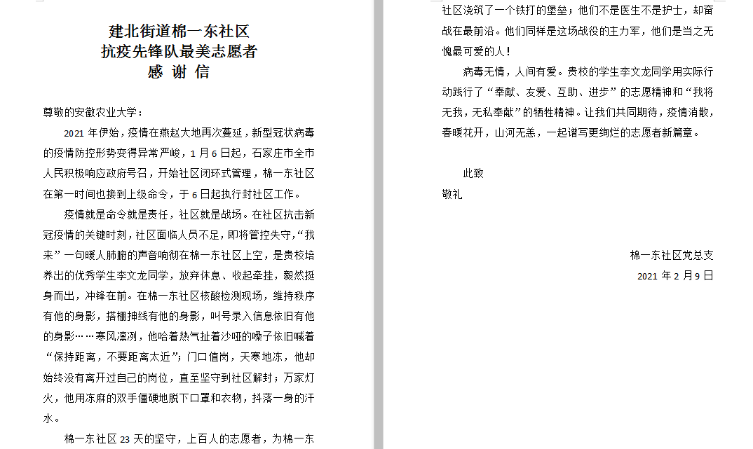 传承雷锋精神,助力疫情防控。2021年伊始,疫情在燕赵大地再次蔓延,在抗击新冠肺炎疫情的关键时期,学院2018级应用心理学专业李文龙主动请战、挺身而出、冲锋在棉一东社区核酸检测现场,维持秩序、搭棚抻线、叫号录入信息,在棉一东社区抗疫一线坚守23天。李文龙用实际行动践行了“奉献、友爱、互助、进步”的志愿精神和“我将无我,无私奉献”的牺牲精神,诠释了一名大学生入党积极分子的初心和使命,展现了新时代大学生的担当和风采。他的表现也受到了石家庄市建北街道棉一东社区党总支的表扬。