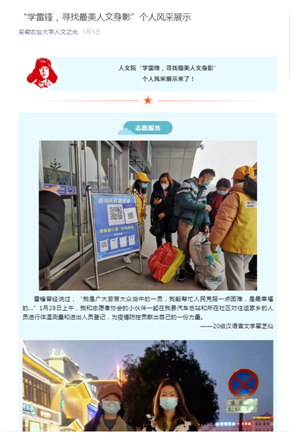 3月5日“雷锋日”当天,学院围绕“学雷锋 践行社会主义核心价值观”主题,组织开展了传递正能量——“学雷锋,寻找最美人文身影”网络风采展活动,用身边人身边事教育引导广大学子积极传播正能量,主动担当将雷锋精神传承下去,发扬开来。