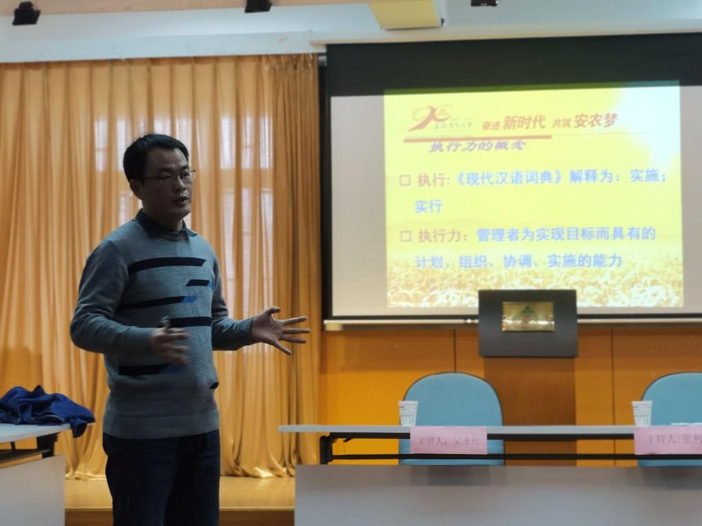 开班后,吴永红以《高校学生干部的执行力》为题,从什么是执行力、学生干部执行力的体现、学生干部执行力的现状与分析、如何提高学生干部执行力四个方面,同本期新生团干部培训班学员进行了深入交流。他强调,团学工作中,执行力既代表团干部的战斗力,也决定团组织的竞争力和发展力,是团干部极为重要的素质和能力。当前学生干部执行力尚存在政令不畅、执行乏力、效率低下等问题,必须予以高度重视。他指出,团干部要从强化责任担当、提高管人管事能力、把握学习力影响力创造力、健全机制等方面出发,切实有效地提高个人执行力。最后,他寄语学员们要争做胆大心细头脑清,顶天立地有本事,政治上靠得住、作风上过得硬的优秀学生干部。