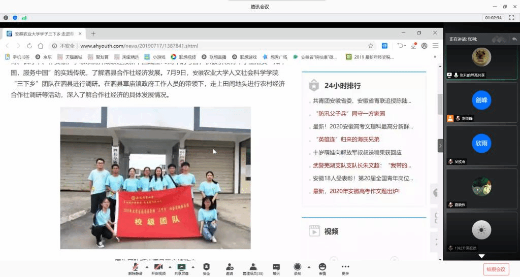 云会议,动员部署2020年暑期社会实践工作。7月15日,学院依托线上平台举办2020年暑期“三下乡”社会实践活动动员部署会,引导青年学子在确保安全的前提下,采取“云组队”“云调研”“云访谈”等形式有效开展社会实践活动,助力家乡复工复产、抗洪防汛、脱贫攻坚。