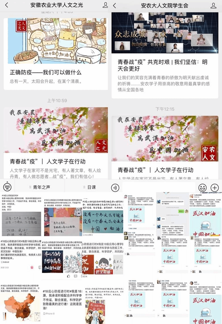 新媒体同步发声,吹响学习集结号。自疫情发生以来,学院充分利用QQ群、人文之光、学生会微信公众号等新媒体平台,组织团员青年开展防控疫情知识线上专题学习;各团支部利用微信群、QQ群等,广泛宣传科学防疫知识,引导团员青年做到不恐慌、不轻视、不信谣、不传谣,遵守各项防控规定,在加强自我防护、自我约束的同时,示范带动身边人提升防疫能力。此外,人文之光公众号还不定期向同学们推送古今中外经典读物,帮助同学们充实假期生活,做到停课不停学。