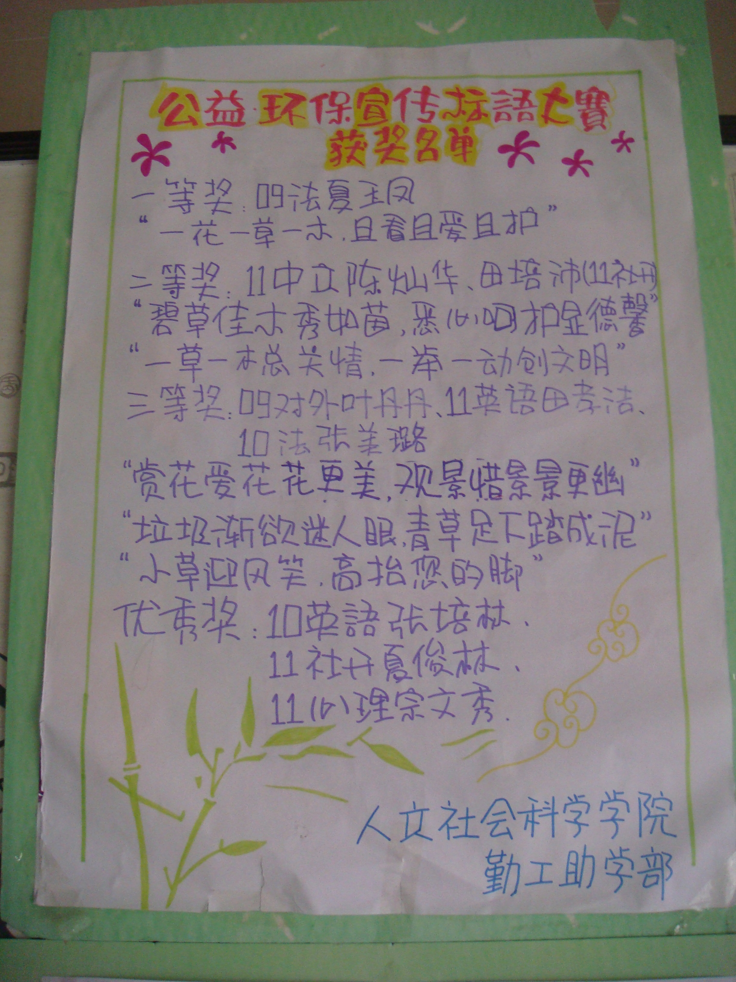 学院勤工助学管理部联合外国语学院勤工助学部于2月19日至2月26日举办“公益、环保宣传标语征集大赛”活动。面向两院400多名受资助同学展开旨在增强环保意识、培养创新精神的标语征集大赛收效颇丰,413人参与标语创作,遴选出40份优秀作品,作品内容丰富,有提倡节约用水的、有反映节能减排的,有倡导保护环境的,其中有9份作品以海报展出方式在校内宣传,鼓励同学们投身公益,倡导环保。