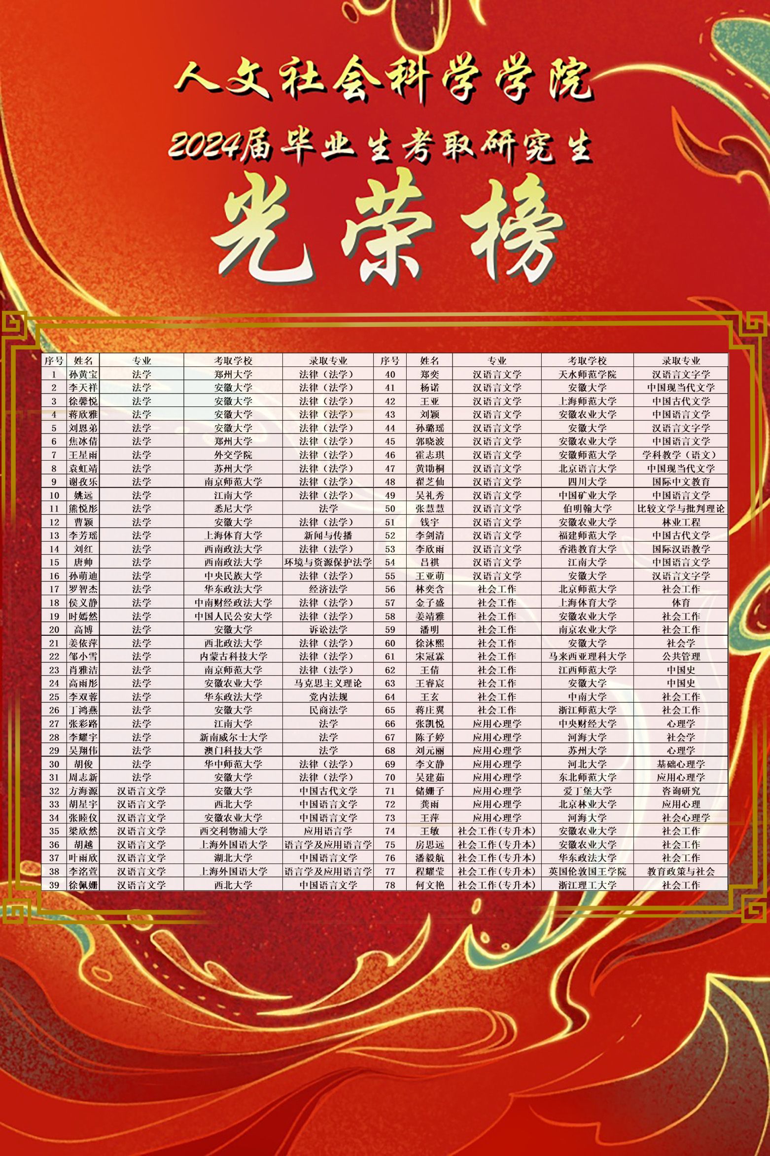 人文社会科学学院2024届毕业生考研光荣榜 日期:2024年07月08日 12:12 作者: 点击: 上一条:人文社会科学学院开展2025年“感恩春晖情,回访高中母校”寒假社会实践培训会 下一条:人文社会科学学院赴黄山文峰学校开展招生宣传工作