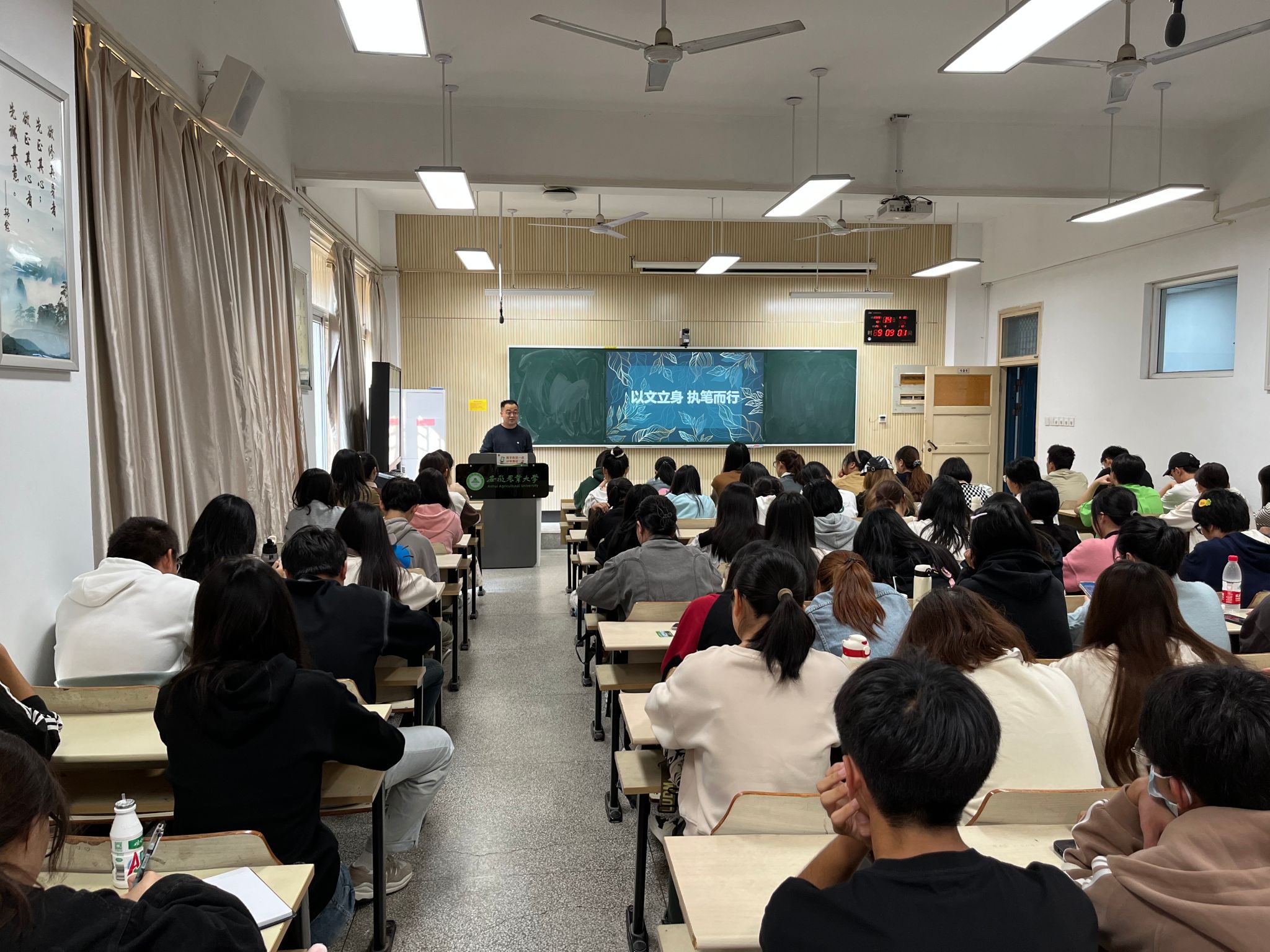 黄洪雷代表学院对焦明仁校友回校分享表示欢迎,感谢焦明仁校友支持学校学生思想启蒙及就业服务工作,助力学生成长。焦明仁校友以《以文立身,执笔而行》为题,结合自身求学经历和工作体会为大家上了一堂内涵丰富的就业指导和人生规划课。报告深入浅出、内容丰富、语言幽默,他以自身多年的驻村扶贫经历为案例,讲述新媒体人的核心素养及价值理念,以职业规划为抓手,生动形象地为中文系同学们讲述了如何培养兴趣、如何制定就业规划及如何在实践中培养专业能力,让同学们对未来职业发展有了更加清晰地认识。最后,焦明仁设置了同学提问环节,向同学们耐心解答疑惑。同学们纷纷就学习、就业发展等问题与其展开了深入交流。