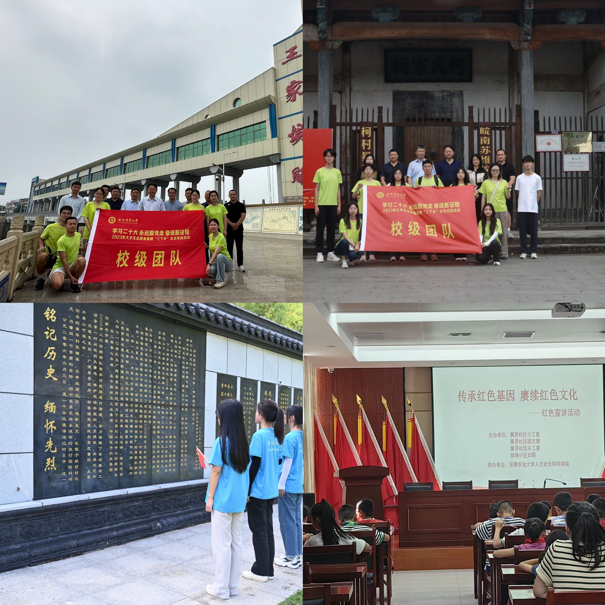 志愿服务团来到柯村镇政府机关、周边街区,以及宝溪、三合、柯村和翠林等村庄,开展了普通话宣讲活动、普通话掌握程度问卷调查和语言景观图片采集,统计了当地居民普通话使用状况、学习状况及学习需求;收集了当地语言景观的发展数据,为后期开展相关语料智库的构建奠定了基础。柯村素有“皖南红色第一村”的美誉,红色语言景观随处可见,团队成员实地开展调研,拍摄记录了柯村暴动纪念馆、柯村祠堂等解说标牌、匾额和烈士语录等红色语言景观。此次活动,团队还与柯村镇政府就“搭建红色语言景观与乡村文化振兴”进行深入交流,为当地红色文化传播提供了新的发展思路,助力当地政府构建语言景观语料智库,精准服务乡村文化振兴。
