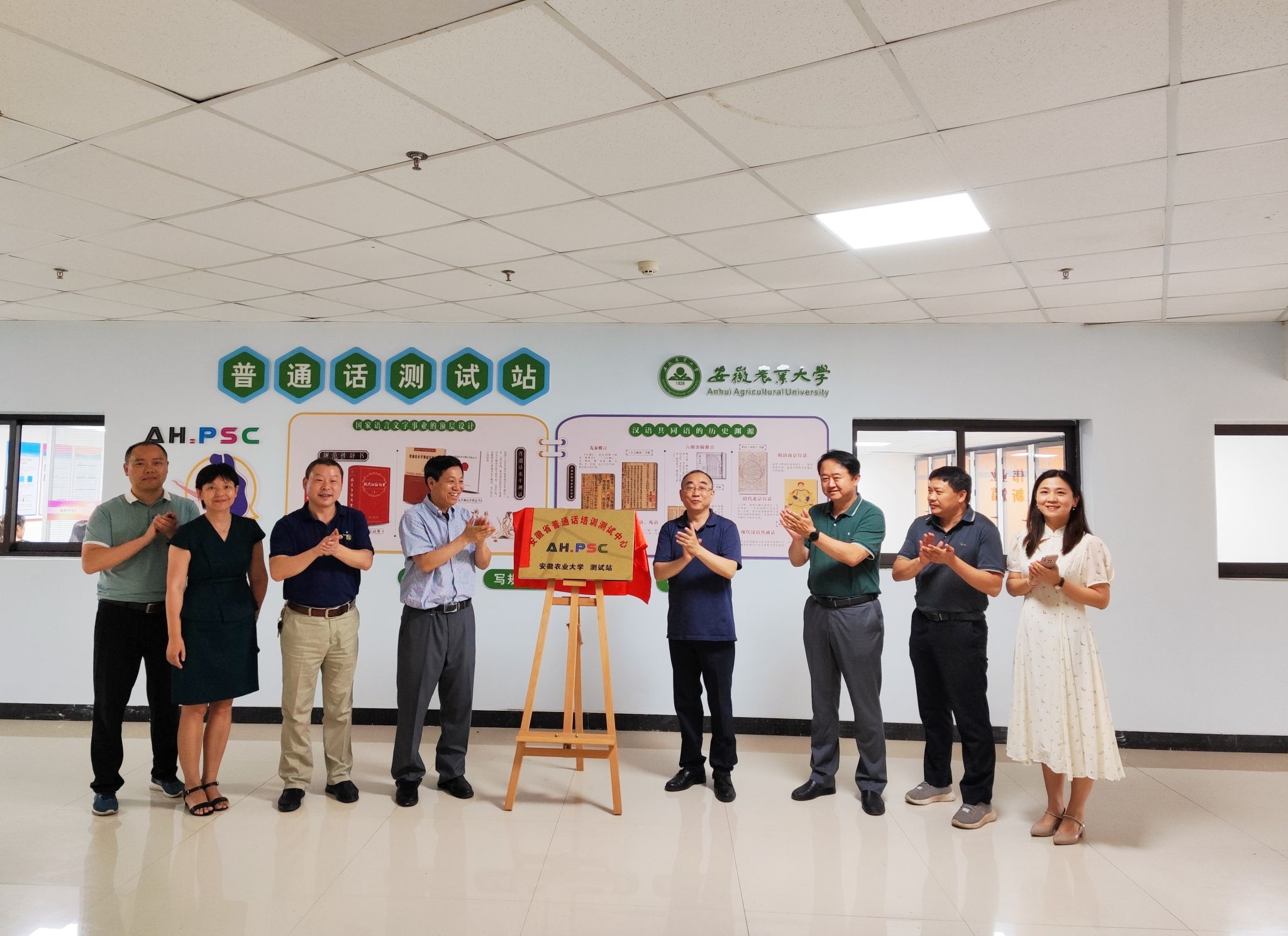 本网讯 6月16日下午,校党委副书记裴树东、安徽省普通话培训测试中心主任单明共同为我校普通话测试站揭牌。教务处、创新创业学院常务副院长徐斌、校语言文字工作委员会副主任黄洪雷、姜红及部分委员参加了揭牌仪式。