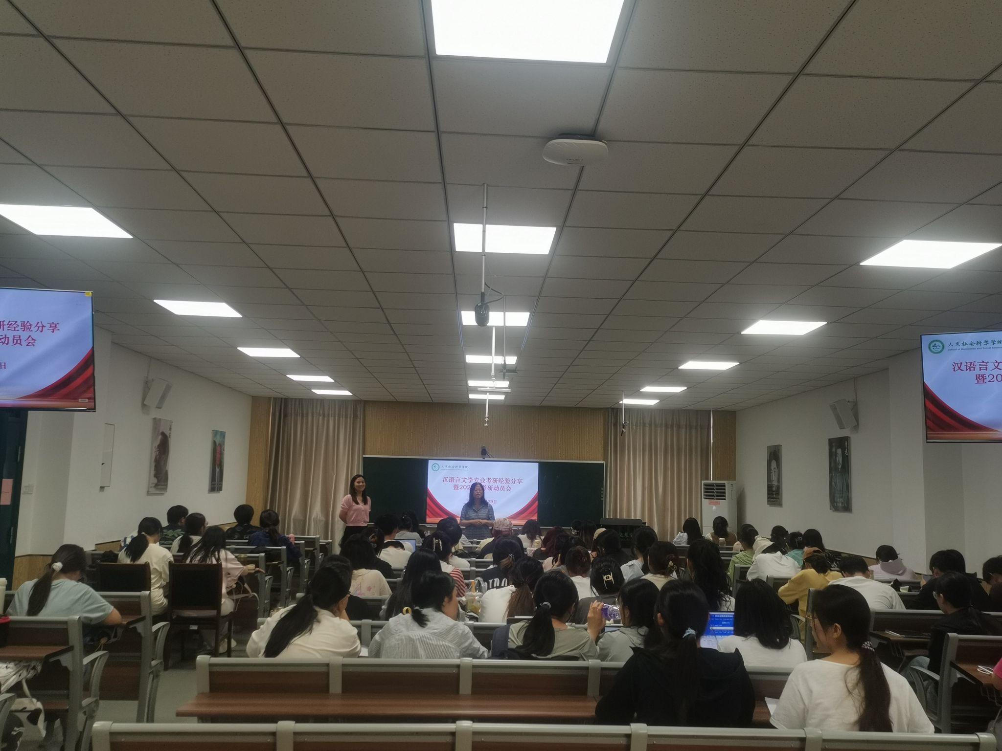 【本网讯】为进一步推进学院新文科建设,5月29日下午,人文社会科学学院在人文楼202教室举办汉语言文学专业考研与职业发展讲座。专业负责人沈琳教授、中文系主任张艺、李辰辰老师以及专业辅导员吴丽雯出席,并特别邀请2021级汉语言文学专业杨子彦、王芮两位学姐分别作考研经验与职业发展经验分享。