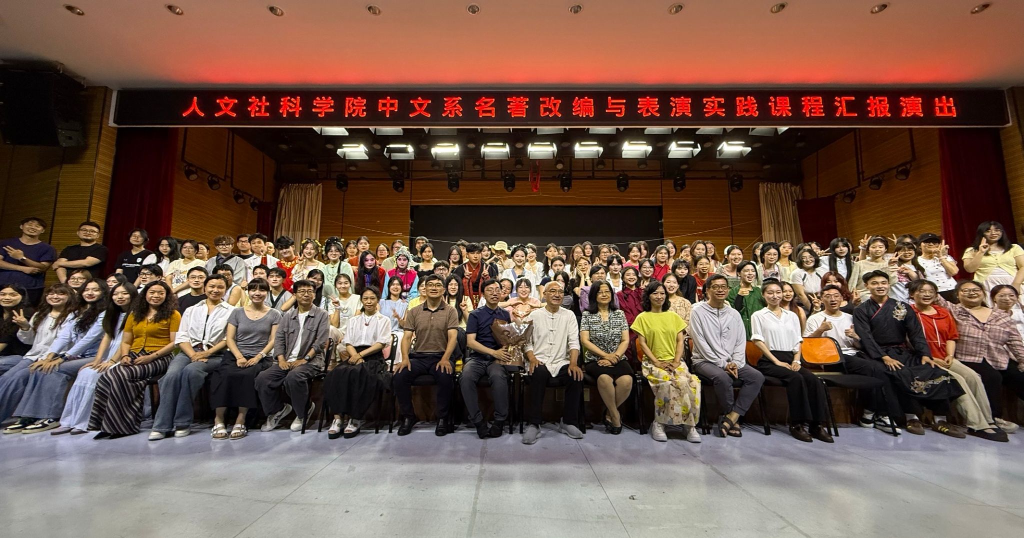【本网讯】 6月14日晚,人文社会科学学院中文系2022级汉语言文学专业全体同学在欣苑四楼小礼堂成功举办“名著改编与表演实践”课程汇报演出。“名著改编与表演实践”是我院汉语言文学专业的一门特色实践课程,旨在通过沉浸式的改编与表演,加深学生对文学名著的理解,以沉浸式舞台探索经典的内核。本年度以“布”和“鼓”作为主题元素,改编了八个短剧,对《红楼梦》《儒林外史》《西厢记》等经典作品进行了现代阐释。