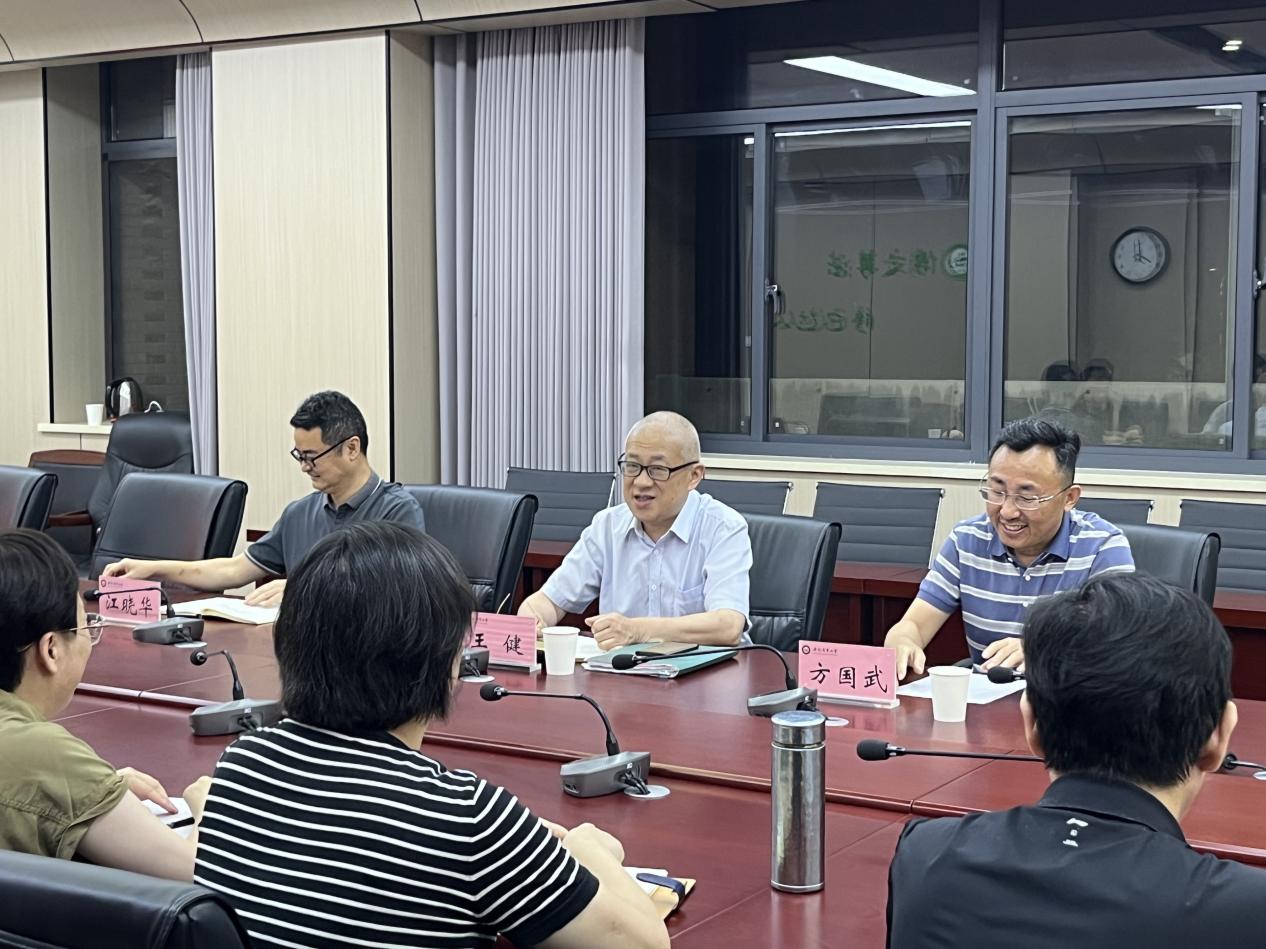 方国武代表学院对王健教授的到来表示了热烈欢迎,江晓华介绍了法学专业新文科认证工作的开展状况,以及申报法律硕士点的准备情况。双方围绕新文科认证中法学专业培养目标、毕业要求、课程体系等关键内容,法律硕士点申报的核心要素、特色凝练及战略规划展开深入交流。王健教授结合他在指导不同学校开展专业认证、学科建设的丰富经验,系统梳理专业认证和学科建设的差异,指出新文科建设重在做好基本功,保障专业培养的毕业生达到既定质量标准,持续改进人才培养各个环节,实现人才培养质量的持续提升。他指出师资力量是法律硕士点申报的关键,法律硕士教育应聚焦“实务导向”,从培养目标、课程体系到特色方向凝练,均需与区域、行业发展深度融合。