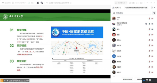 分享会由学术论文汇报和学业经验交流两部分组成。燕家玉同学作为主讲人,详细汇报了其学术论文《地名“郢”“孜”连用现象及其地理分布》的研究成果。该研究创新性地运用ARCmap GIS地理信息系统和SPSS数据统计工具,从语言学角度对安徽地名进行了深入分析,充分体现了文农融合的新文科研究特色。燕家玉还现场演示了中国国家地名数据库、古音小镜等研究工具的使用方法,分享了选题来源、研究过程及参会投稿的宝贵经验。